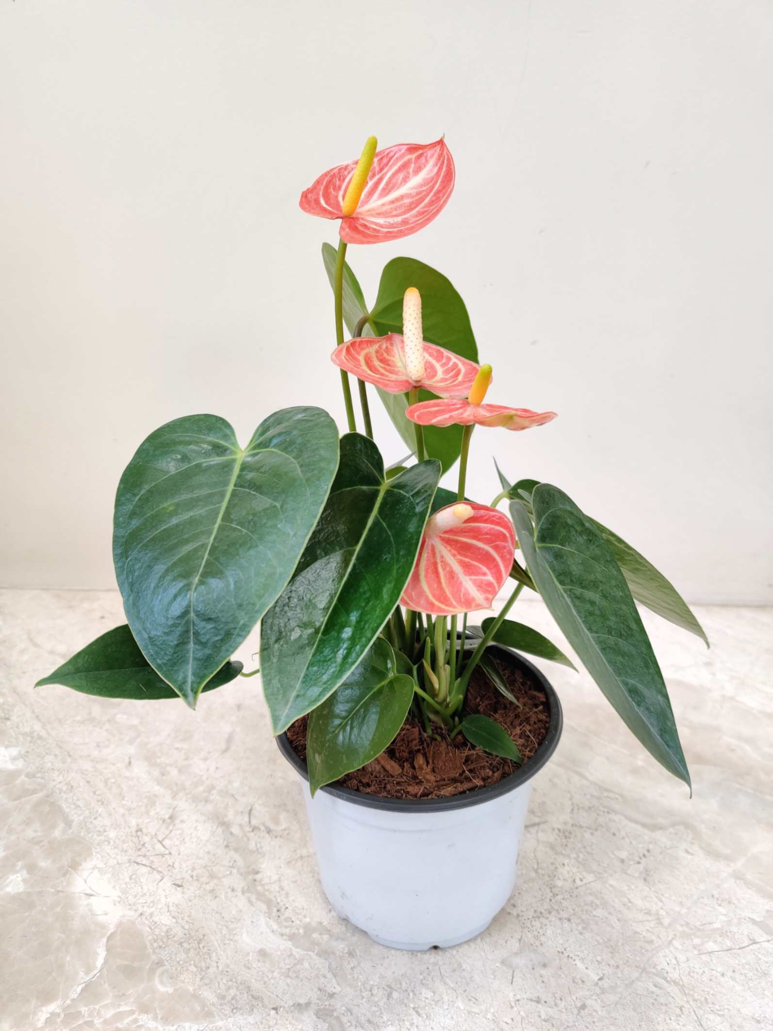 Anthurium “Fuxing” (or similar red/pink varieties offered by sellers like Creative Farmer) in a 12 cm (approx. 4.7-5 inch) pot is a compact, low-maintenance indoor flowering plant. It is widely known as a Flamingo Flower or Flamingo Lily.