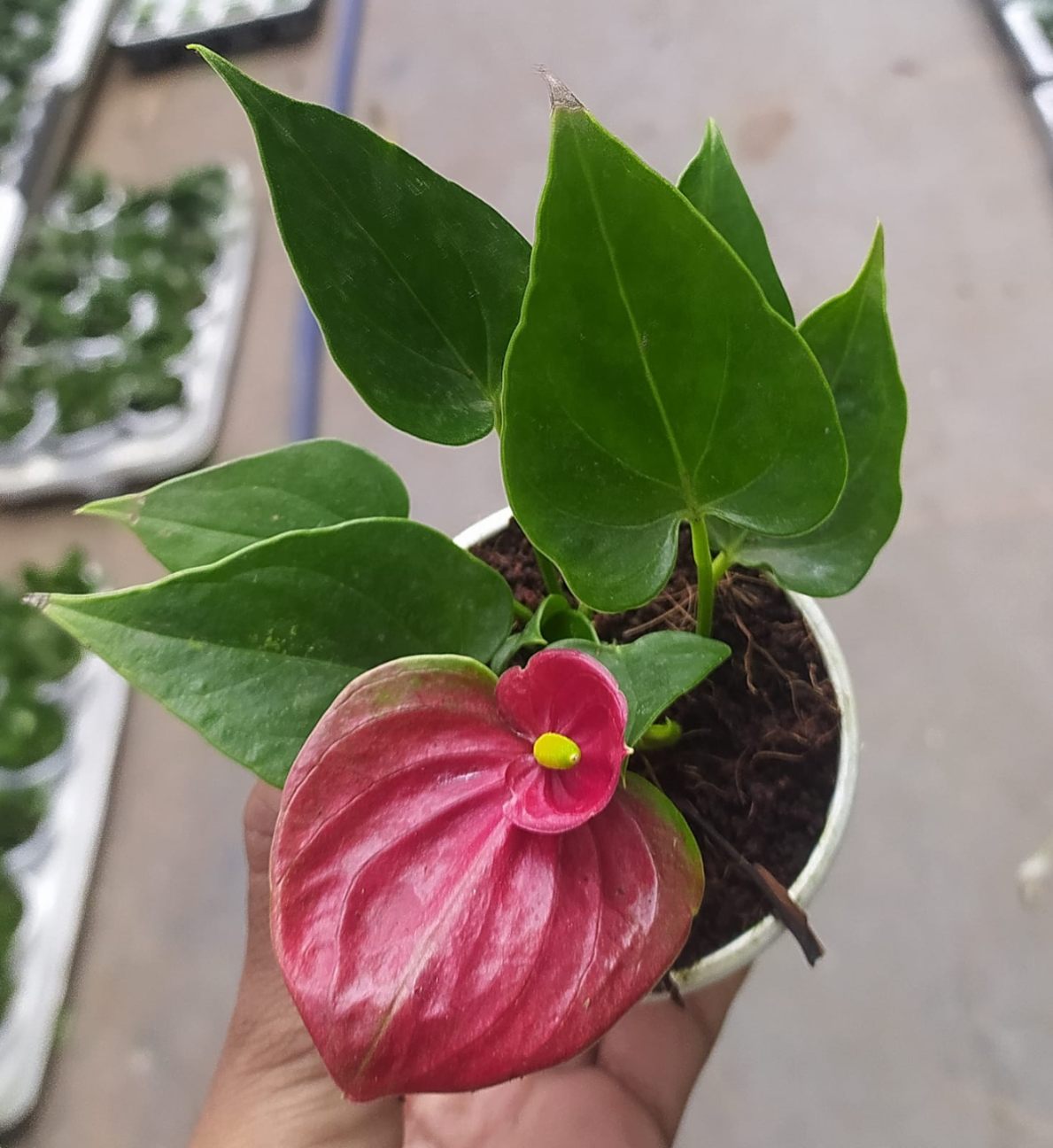 The Anthurium Red in a 10 cm pot (also known as the Flamingo Flower) is a popular, compact indoor flowering plant cherished for its vibrant, heart-shaped red flowers—technically known as spathes—which are actually modified waxy leaves. These plants are widely favored for their ability to bloom continuously throughout the year with proper care, making them an excellent choice for home or office