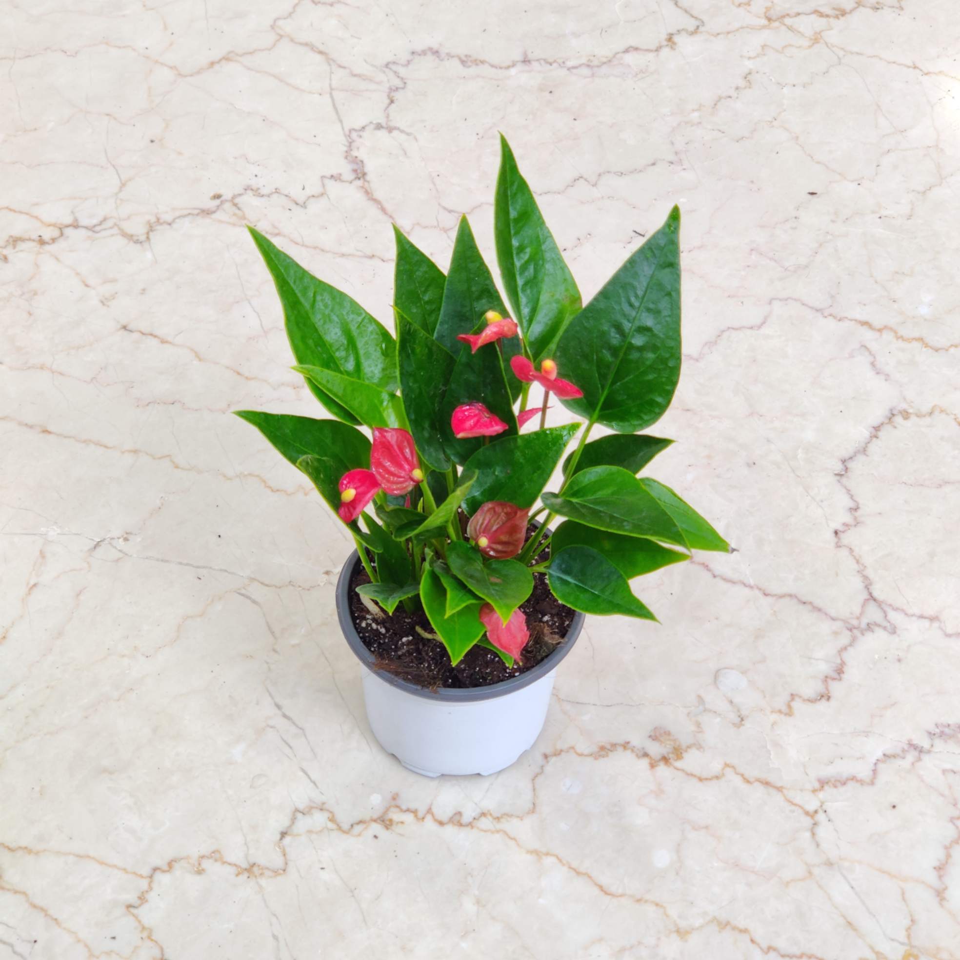 Bright Red Blooms: Features glossy, heart-shaped red spathes with yellow spadix, adding vibrant color and elegance to any indoor space.