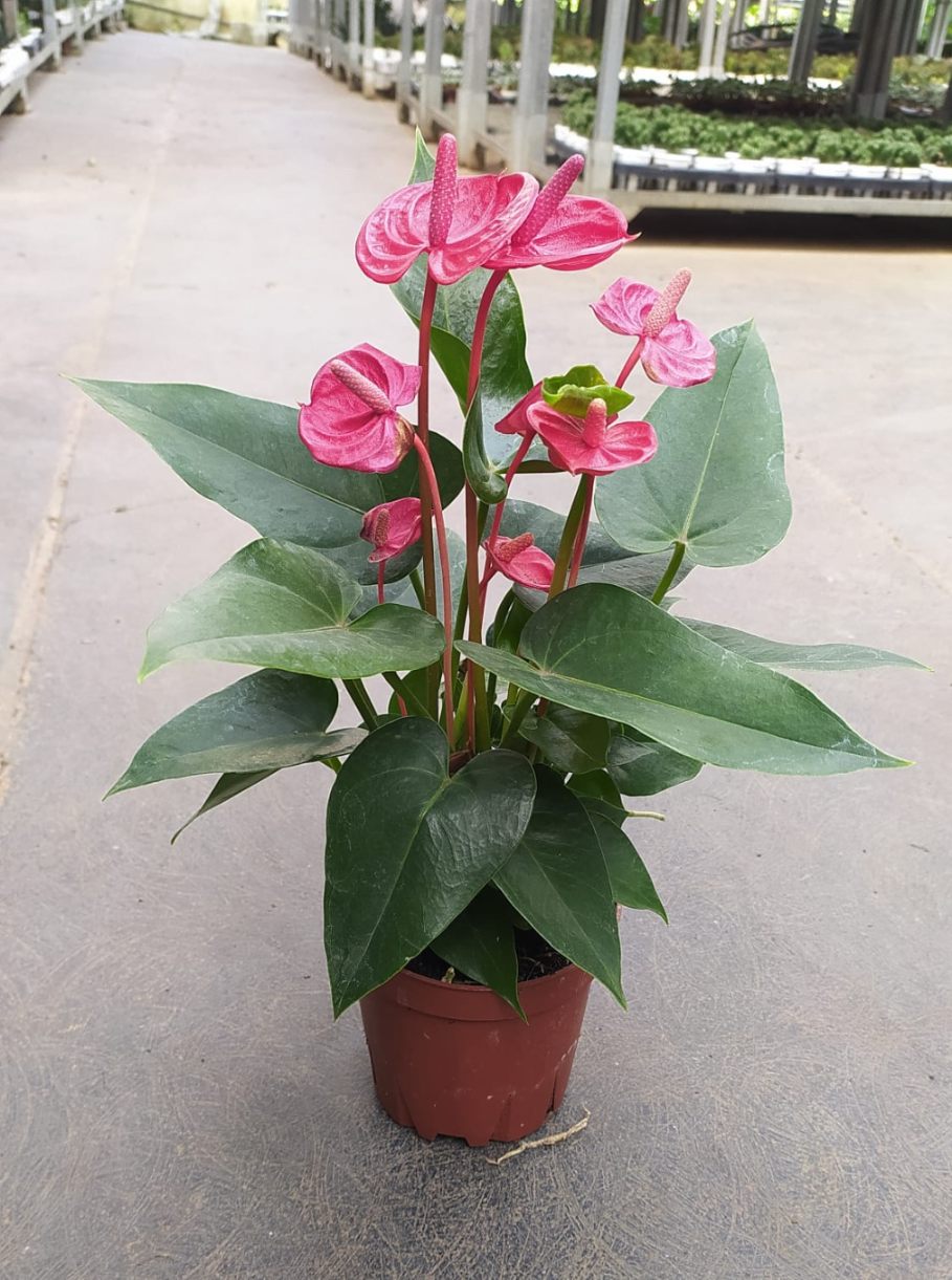 Also known as Flamingo flower or boy flower these popular houseplants have eye-catching, waxy heart-shaped red spates (often referred to as flowers) with yellow spikes (spandex) sticking out from the centre of each spate on dark green foliage.