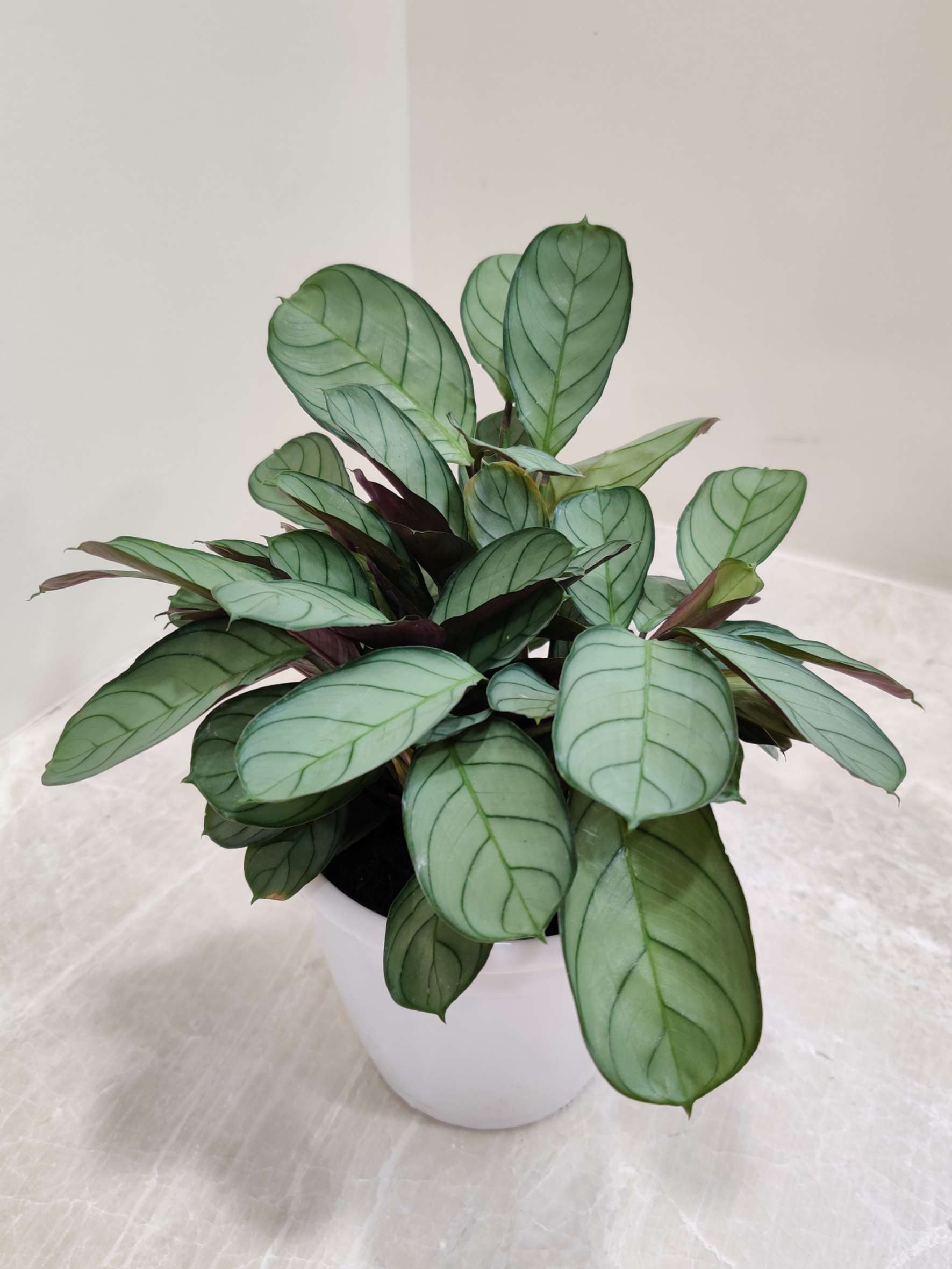 The Ctenanthe burle-marxii ‘Amagris (often sold as Calathea ‘Amagris’) is a compact, slow-growing tropical, renowned for its pale grey-green leaves with dark green “fishbone” stripes and deep purple undersides. Known as a “Never Never Plant,” this pet-friendly, air-purifying plant thrives in bright, indirect light and creates a dramatic display at night when its leaves fold upward.