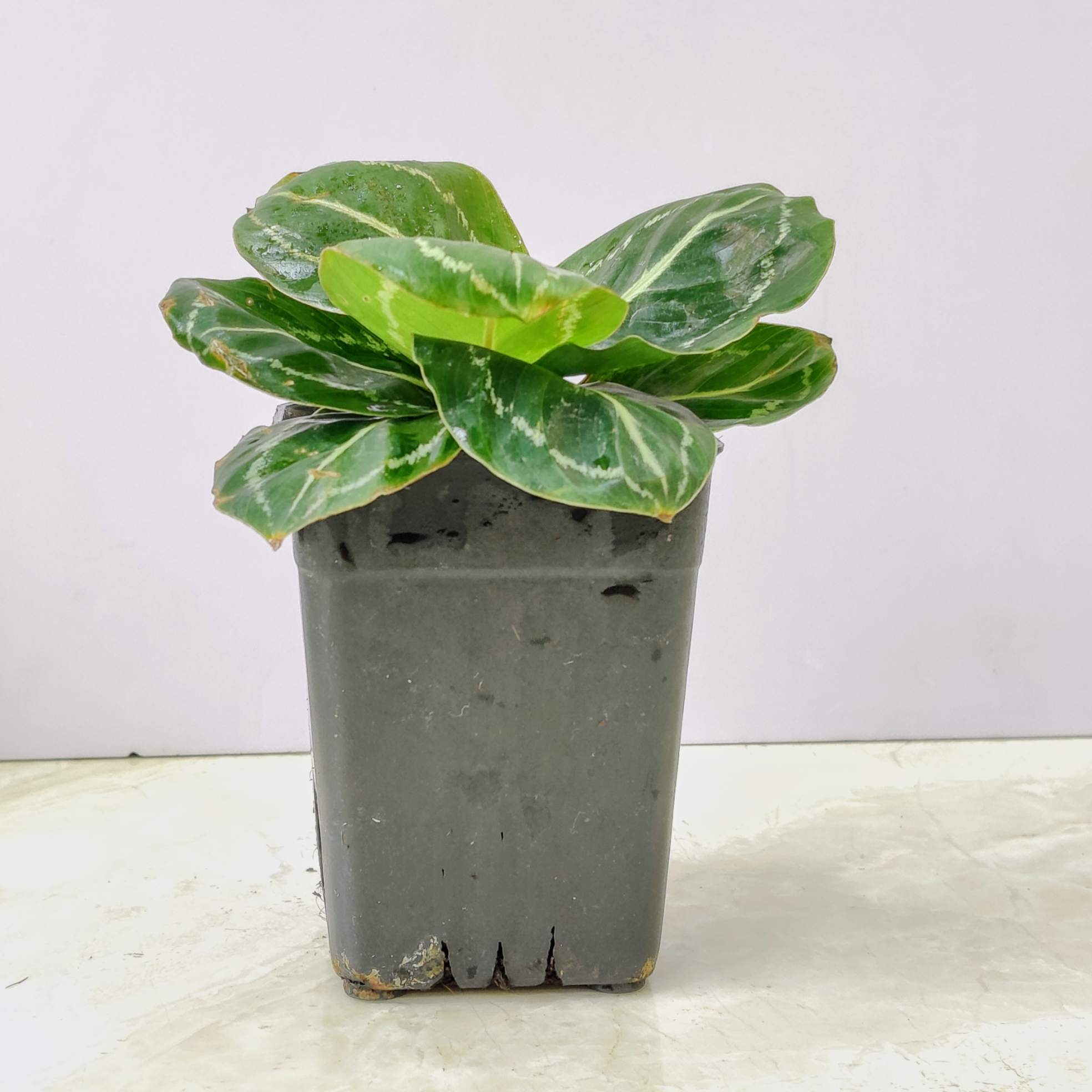 The Calathea ‘Green Lipstick’ (Goeppertia roseopicta ‘Green Lipstick’) is a striking tropical houseplant known for its glossy, dark green leaves featuring distinctive lighter green or cream-colored brushstroke markings along the midrib and edges. As a prayer plant, it folds its leaves at night, revealing a deep reddish-purple underside.