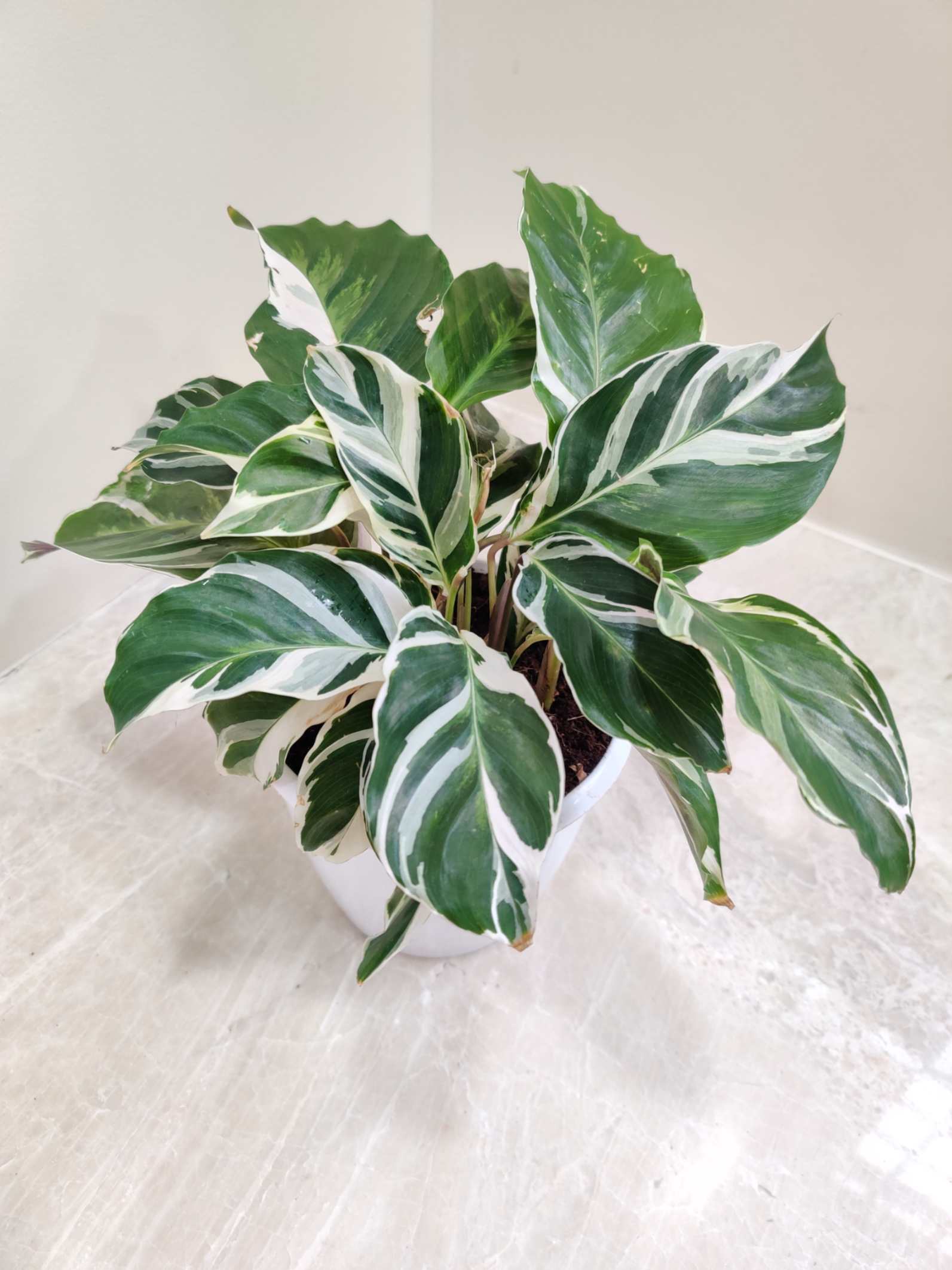 Calathea ‘White Fusion’ (Goeppertia lietzei ‘Fusion White’) is a highly prized, rare tropical prayer plant known for its striking, painted foliage—creamy white, mint, and dark green variegated leaves with deep magenta-purple undersides. It is a compact, bushy plant that thrives in bright, indirect light and high humidity, featuring nocturnal leaf movements, making it a dramatic, non-toxic addition to indoor spaces.