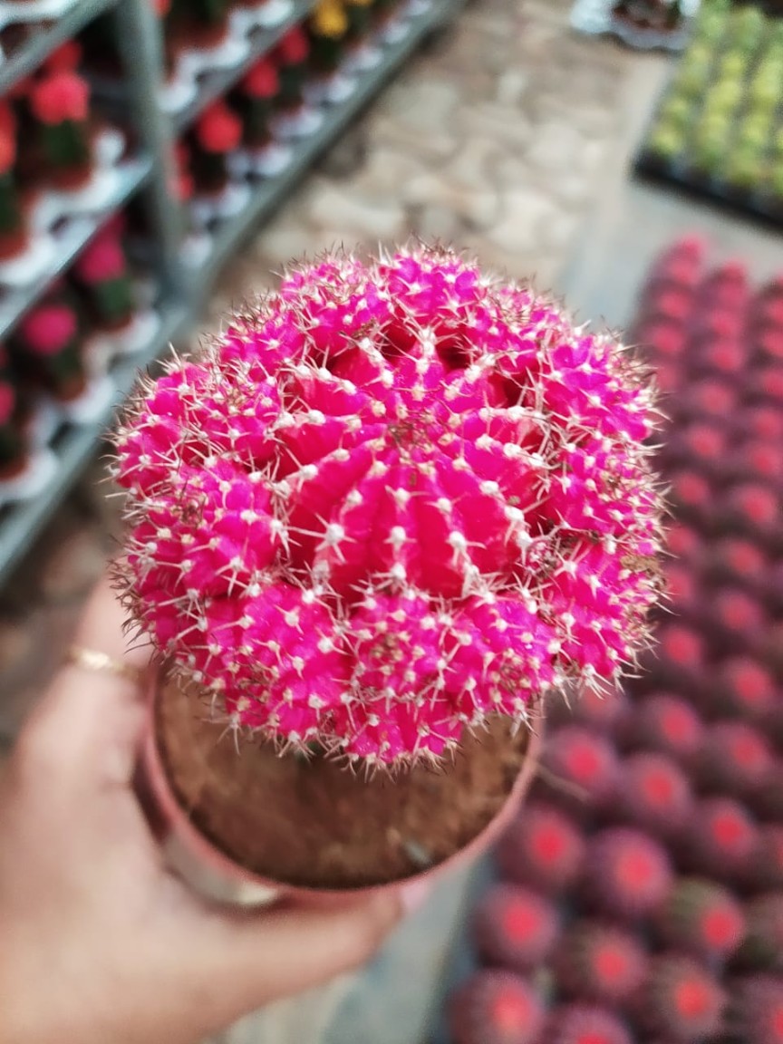 The Grafted Pink Moon Cactus (Gymnocalycium mihanovichii grafted onto Hylocereus), commonly 3–4 inches tall, features a vibrant, bulbous pink top—a mutant lacking chlorophyll—set upon a green, chlorophyll-rich rootstock. This striking, low-maintenance succulent thrives in bright, indirect light, requiring sparse watering, making it ideal for indoor, colorful displays.