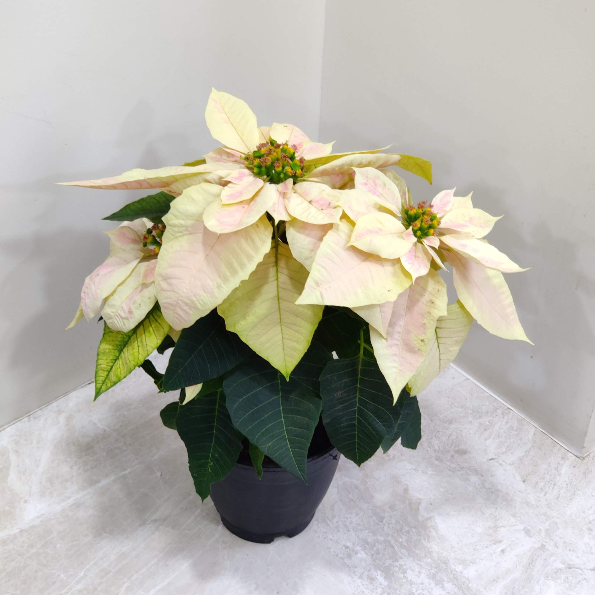 The Poinsettia (Euphorbia pulcherrima) is a tropical shrub native to Mexico, famous for its large, colorful, and leaf-like bracts (red, pink, or white) that surround small yellow flowers (cyathia) in winter. Primarily used as a Christmas houseplant, it grows 1–3 meters tall outdoors but rarely exceeds 1 meter as a potted plant.