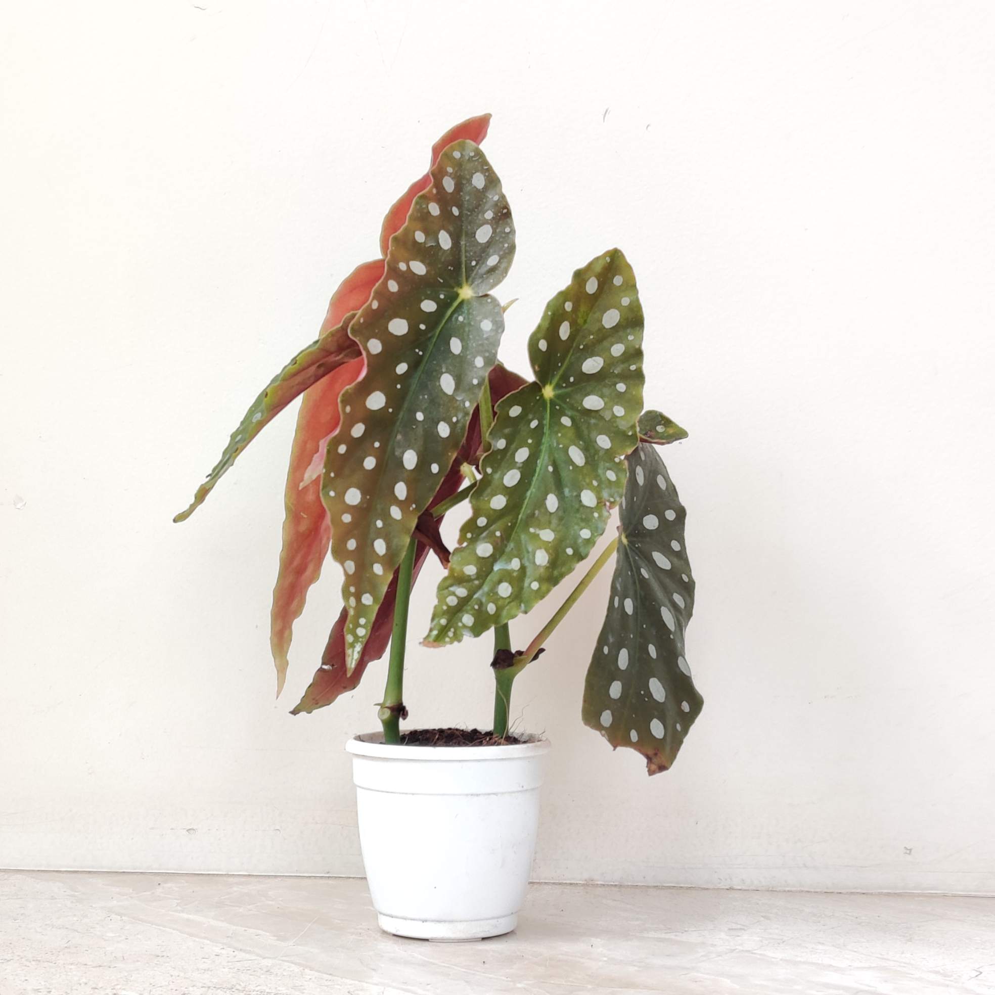 Begonia maculata, also known as the polka dot begonia, is a tropical perennial with spotted, elongated leaves. This striking begonia ranges from olive to a rich, forest green, and the spots appear pale grey or silver; the undersides of these dramatic leaves are a rich burnt orangey red.