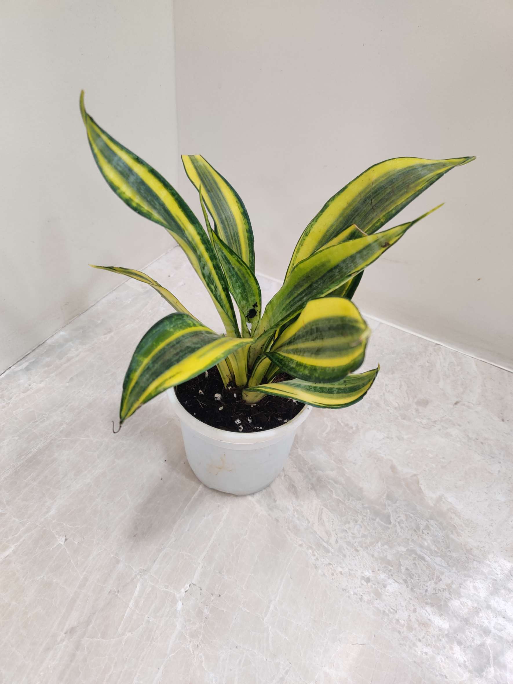 The Crooked Snake Plant (Twisted Sister Snake Plant) has vibrant gold and green variegated foliage with unique twists and curls, making it a beloved indoor favorite. Its striking silvery-green markings add an artistic flair to any space.
