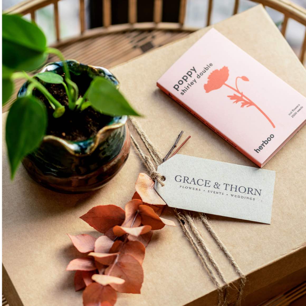 Watch your seeds grow into poppy doubles in reds, whites and pinks. Accompanied with a ceramic plant pot with a plant.