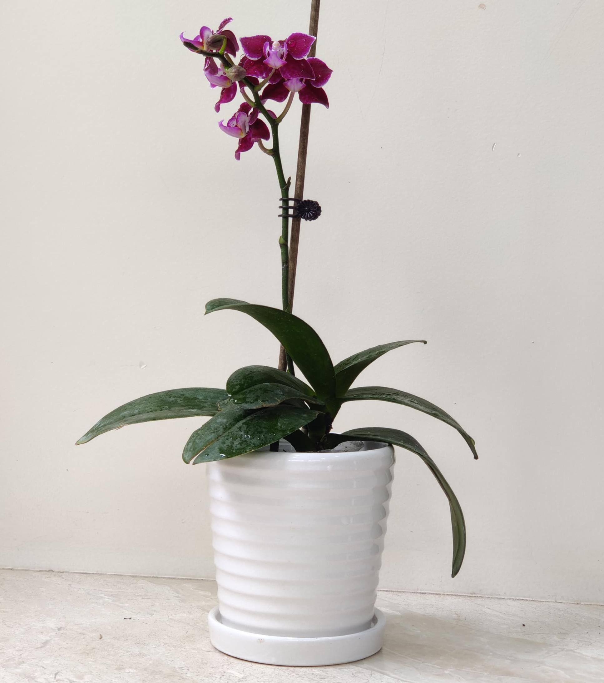 “This captivating Vanda orchid features delicate white blooms and rich green foliage, beautifully arranged in a charming pot. Expertly crafted for realism, it offers effortless elegance and is perfect for enhancing any décor—no maintenance required.”